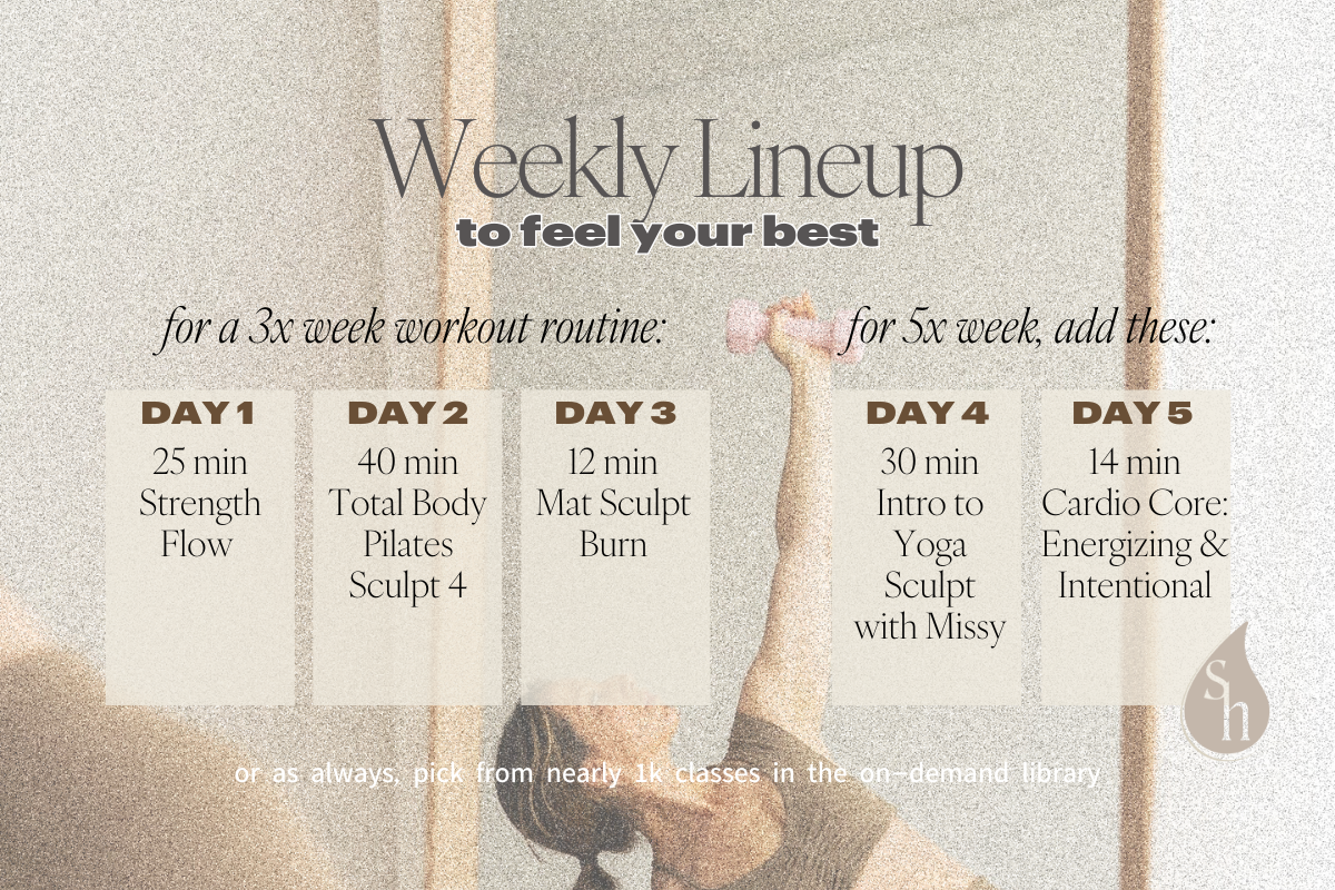 This is your weekly plan to stay consistent without overthinking it. Updated every Monday, it’s like walking into your favorite studio and seeing the lineup for the week. You’ll get a curated mix of new and rotating classes to follow—whether you want to commit to 3x or go all in with 5x. Just press play and show up.